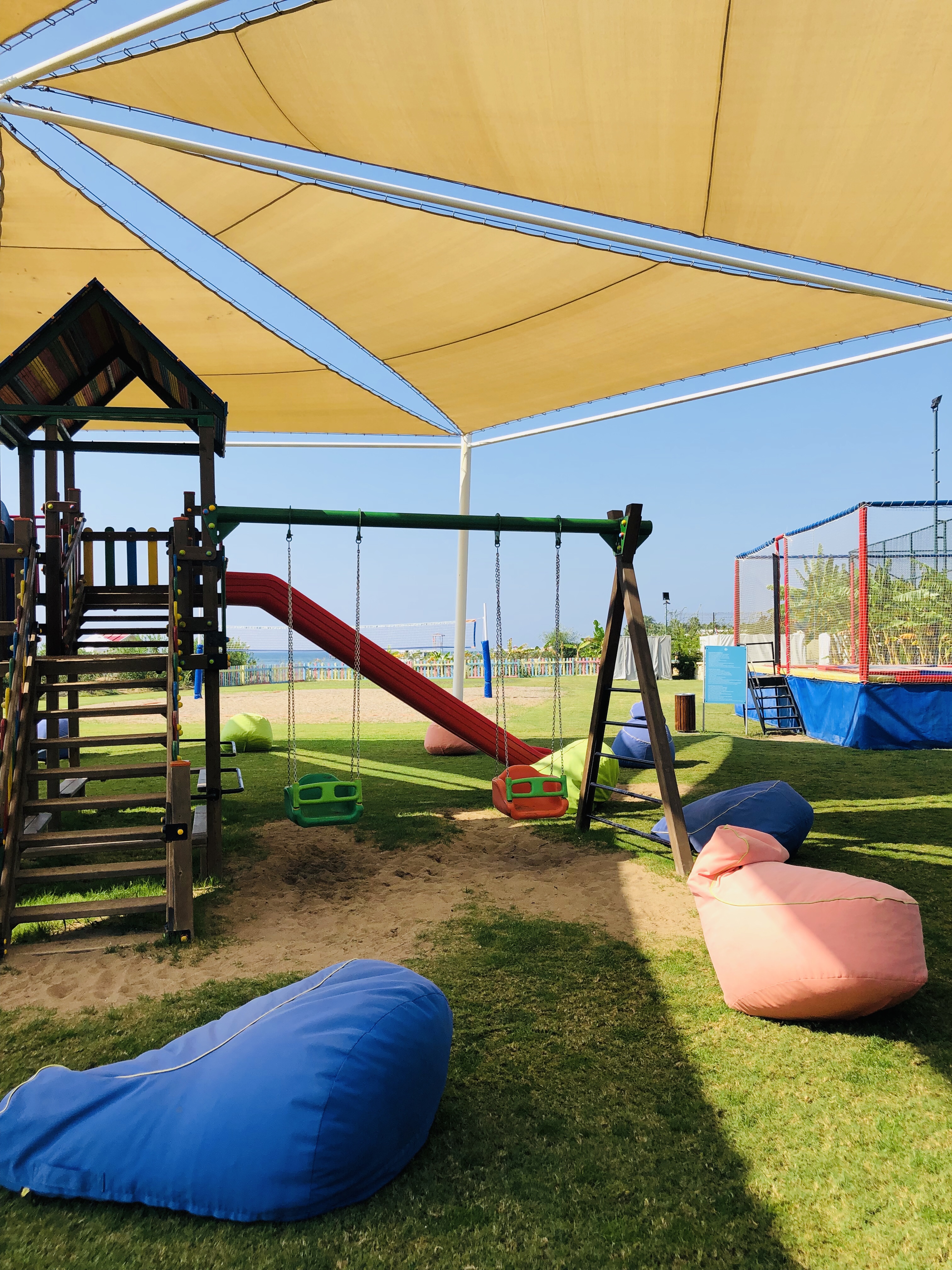 Hotellet med en vacker grönskande trädgård, stora grönytor, lekplatser för barnen och vajande palmer. Här finns flera pooler och en kort promenad genom hotellets trädgård breder det gnistrande Medelhavet och den vidsträckta sandstranden ut sig. Det råder ett behagligt lugn på hotellet. Här behöver man inte gå upp tidigt på morgonen för att paxa solstolar, det finns gott om solstolar både på stranden och vid poolen.