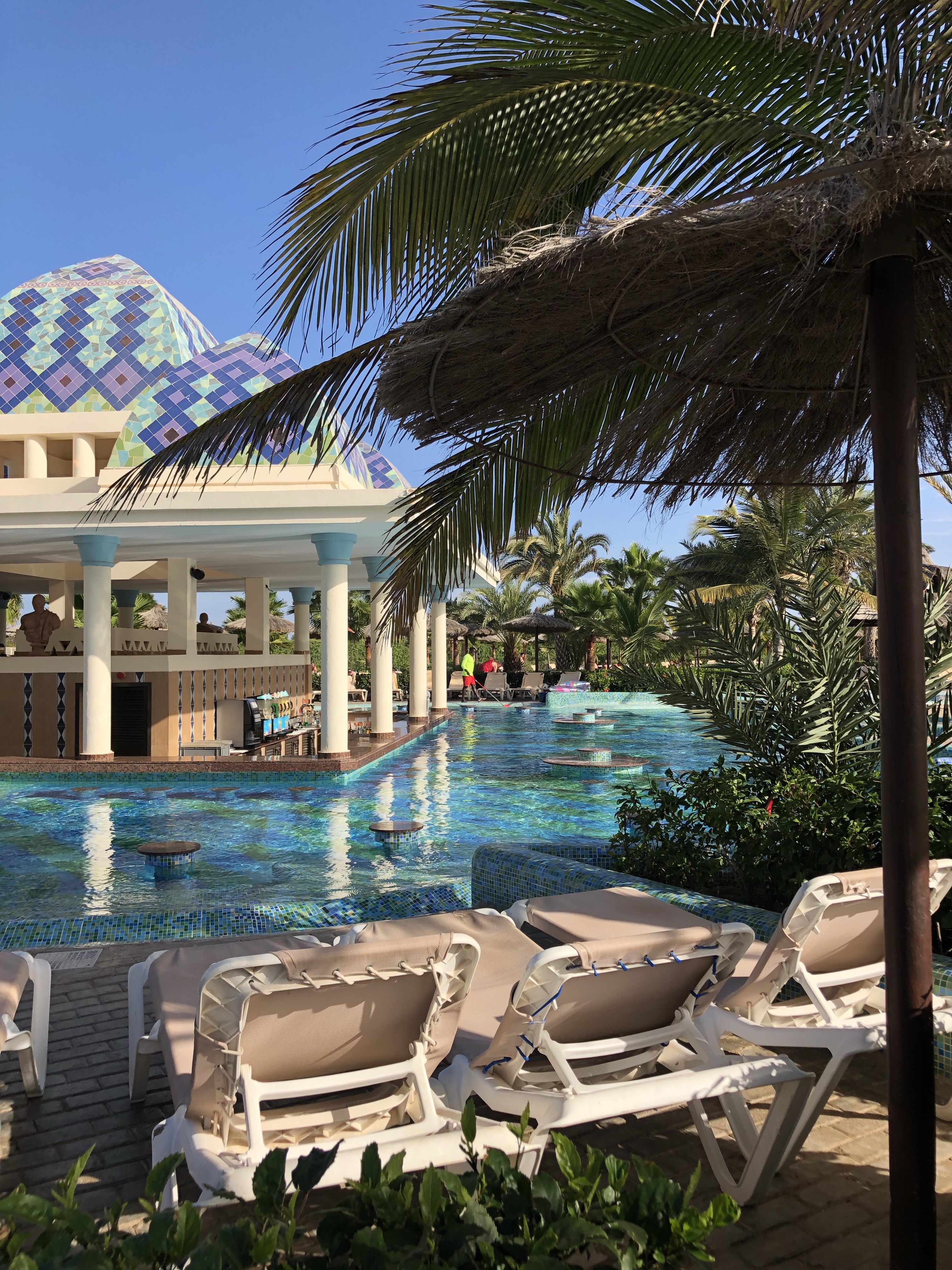 Systerhotellet Riu Karamboa byggt 2008 är ett stort klassiskt hotell i traditionell pampig stil. Här är tempot höge, och här finns fler människor.