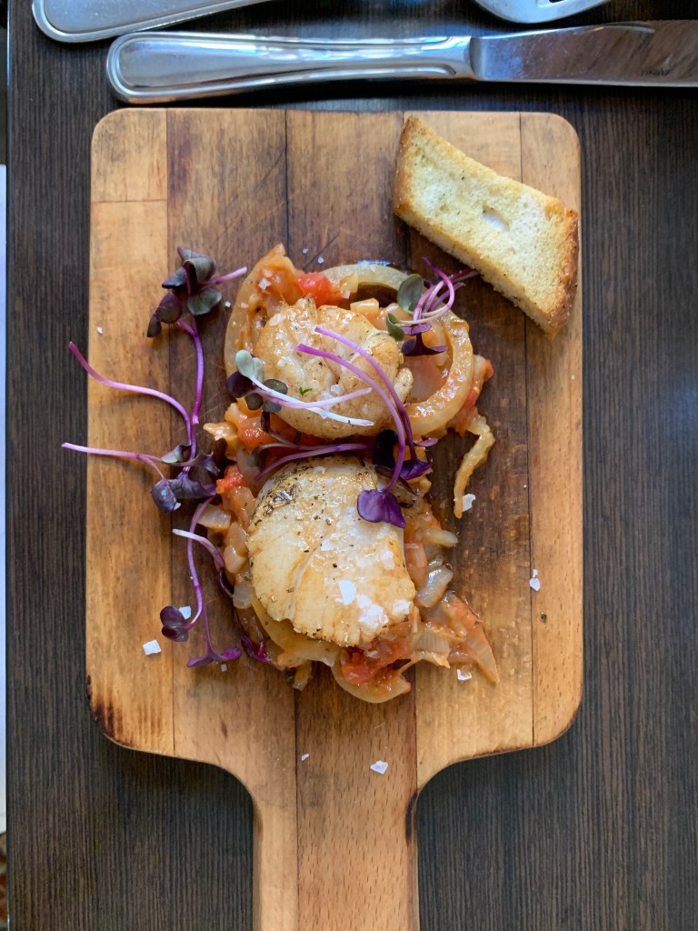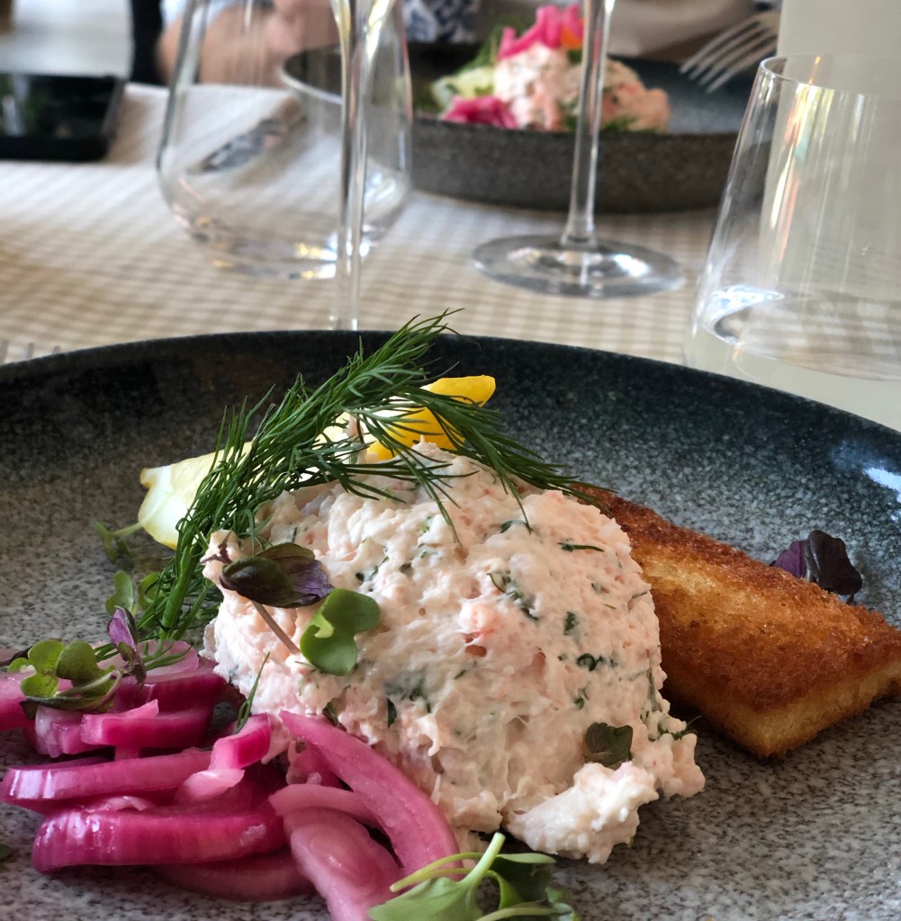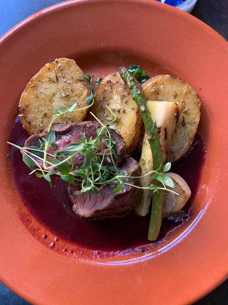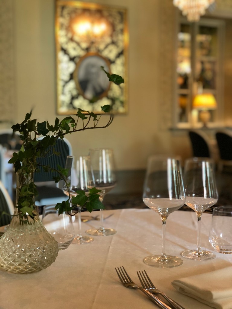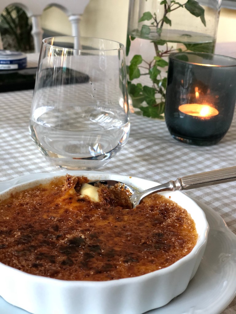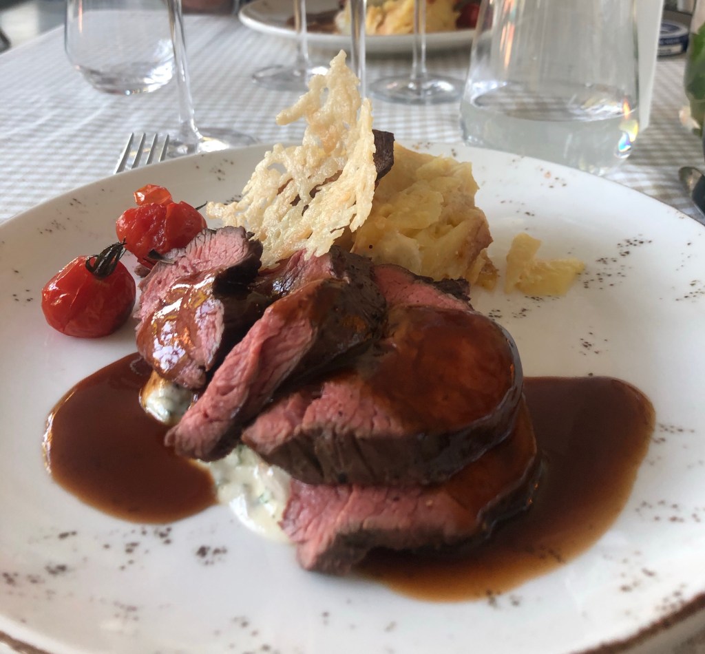 Vi hade bokat ett paketet där det ingick en trerättersmiddag. Menyn var en fast meny och maten var klassisk, vällagad och god. Till förrätt blev det en Toast Skagen, huvudrätt helstekt oxfilé och efterrätt Creme brûlée.