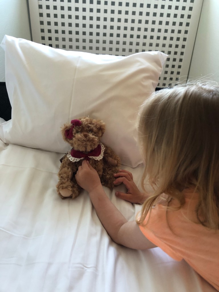 – Jag äääälskar hotell förklarar vår lilla tjej bestämt för hotellreceptionisten. Ännu mer övertygad blev hon när hon fick en söt och gosig liten nalle av den gulliga hotellpersonalen. Lyckan var total!
